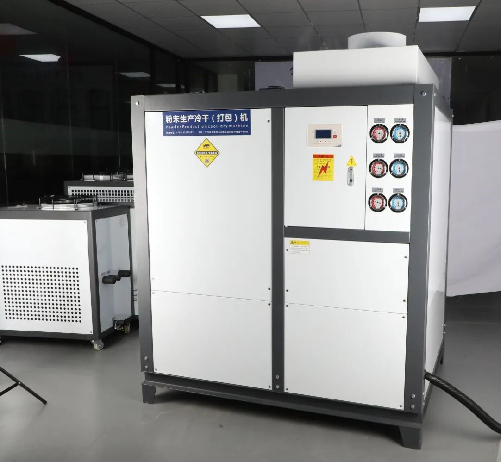 樂暢研發(fā)的這款粉末冷干機(jī)主要是針對(duì)粉末廠。因?yàn)榉勰┰诖虬^程中會(huì)產(chǎn)生結(jié)團(tuán)的現(xiàn)象,需要冷風(fēng)機(jī)吹冷風(fēng)來解決結(jié)團(tuán),提升打包效率。它的制冷原理是通過吸干凈的自然風(fēng)進(jìn)入機(jī)器內(nèi)容,通過壓縮機(jī)制冷,將冷風(fēng)機(jī)吹到客戶所需的環(huán)節(jié)上。